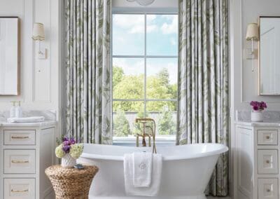 Window treatments bring their own kind of elegance. Full, tailored drapery framing a soaking tub softens architectural lines and balances harder surfaces like marble and tile, while introducing color and movement. Even in bathrooms with generous natural light, fabric panels or tailored shades add warmth and a sense of privacy that feels indulgent. The interplay of pattern, texture, and light—floral walls paired with sculptural mirrors, or leafy drapery brushing against crisp white trim—creates a room that feels layered yet effortless. It’s these thoughtful textile moments that transform a bathroom from utilitarian to unforgettable.