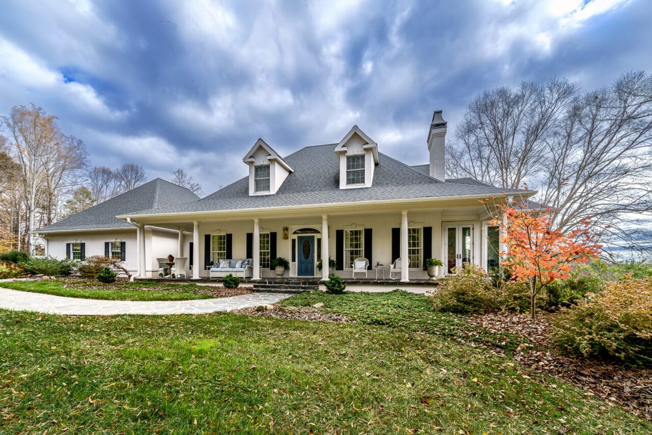 With the front door painted in Philipsburg Blue, a favorite of ours from Benjamin Moore, this gave us a basis for the design of this serene front porch. The eggshell toned stucco exterior and stone floor gave us some room to play with the color selections, while the front door guided us to beautiful fabrics and textures that sung the same tune. Our focus was to transform this space from simply the front stoop to a place to relax and take in the amazing view this home has to offer. We accomplished this by adding plenty of seating, adorned with colorful, patterned throw pillows, in the form of rocking chairs, a comfy sofa, and a quaint dining set. On both sides of the front door, we added new brass lanterns to complement the new door hardware, while paying homage to the interior lighting. We brought life to this space that makes a great first impression of this home that continues once you step inside.