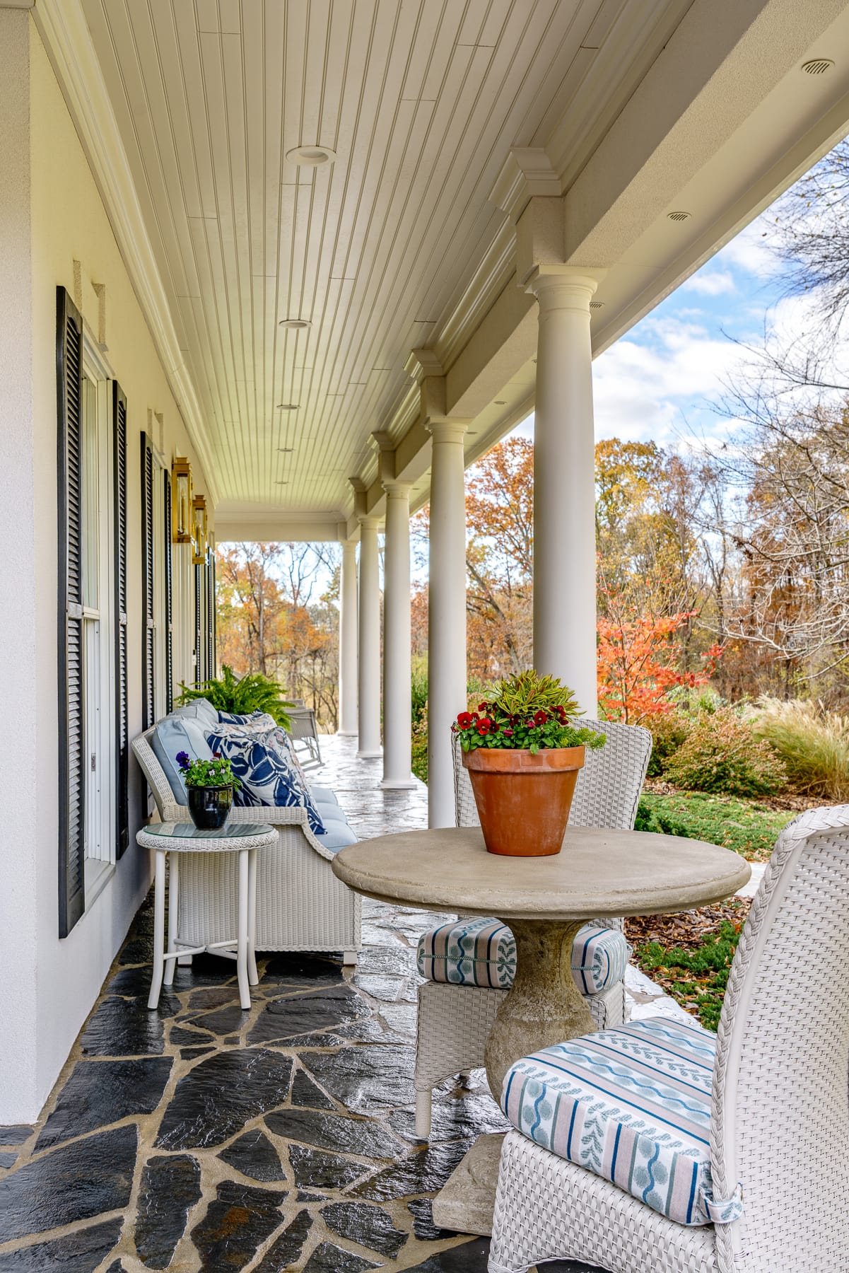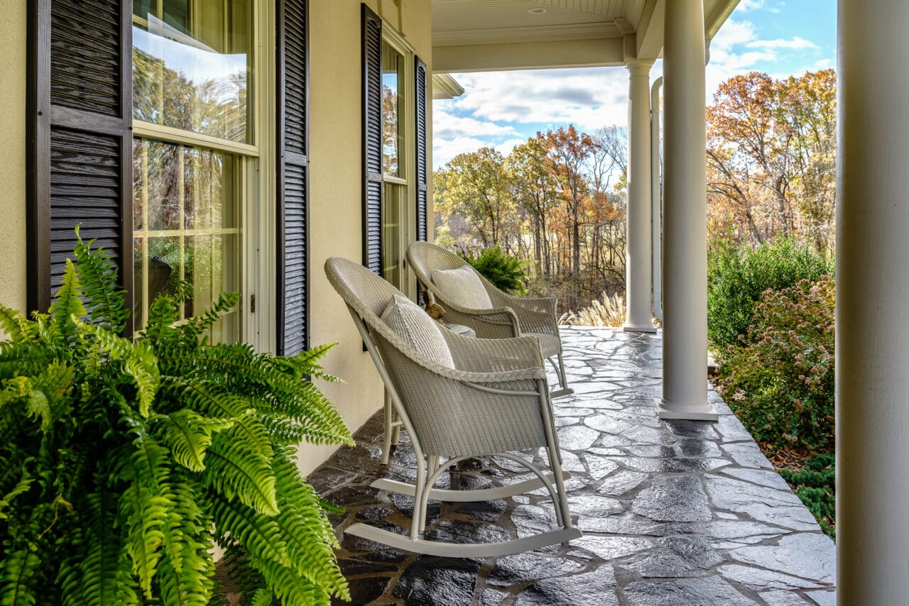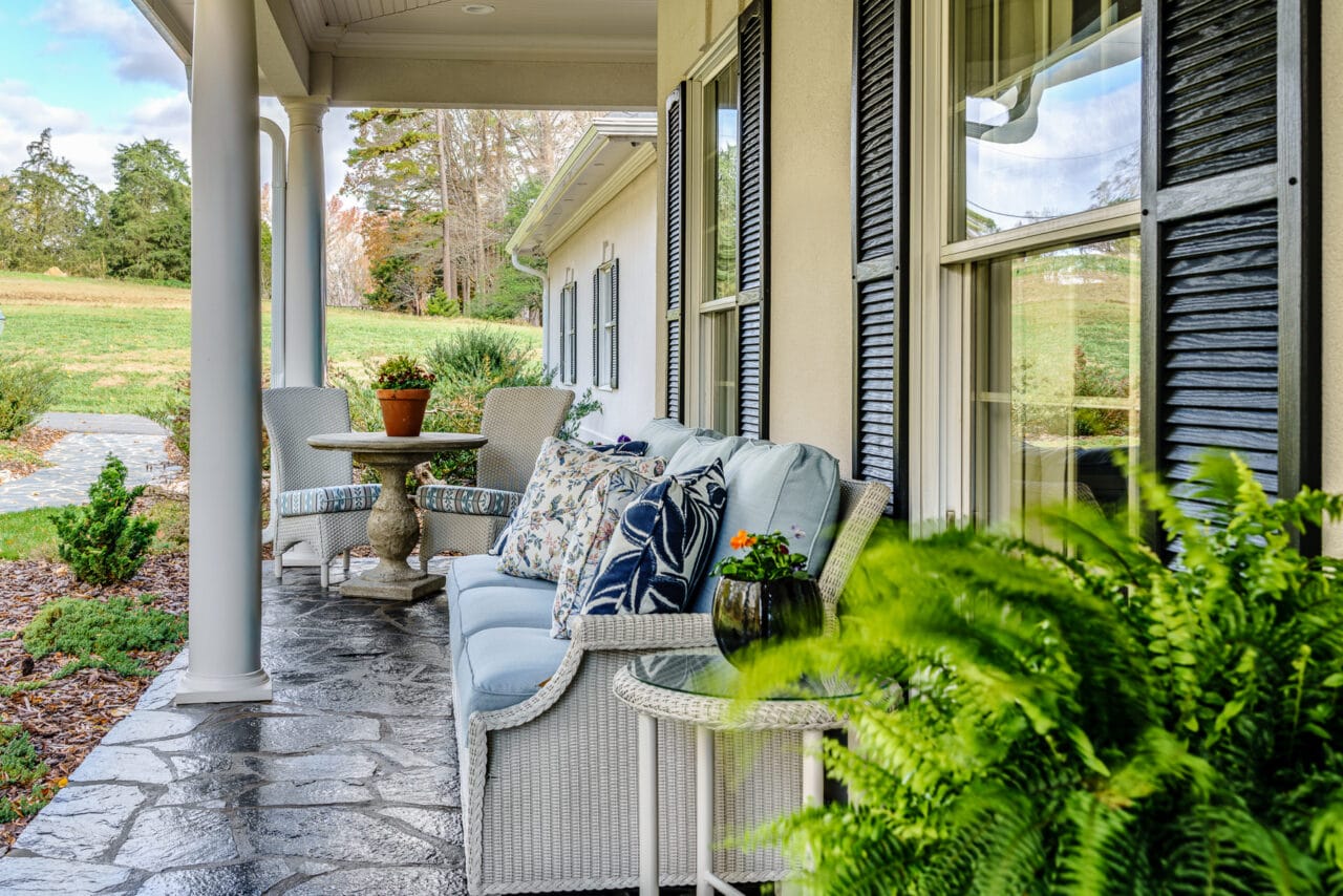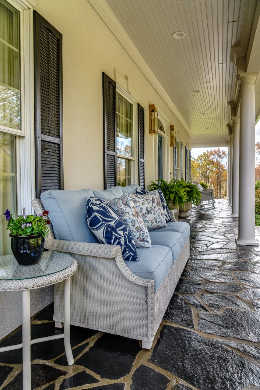 We were ecstatic about continuing the Elegant Escape & Estate Elegance project at East Bend that extended to our clients’ front porch. The vision we had in mind was creating a welcoming atmosphere that matched the remodeled front interior, encapsulating a peaceful oasis of cool toned hues and natural textures. This phase of the project was added on towards the end of the remodel, but we ensured that it felt cohesive with the rest of the design.
