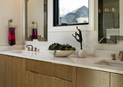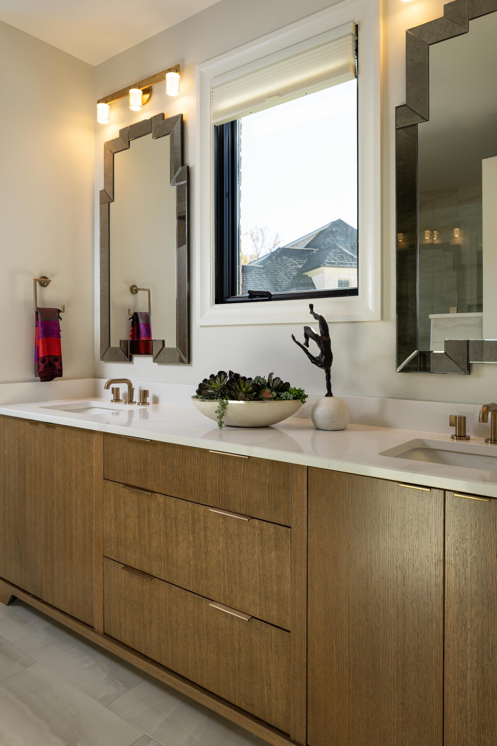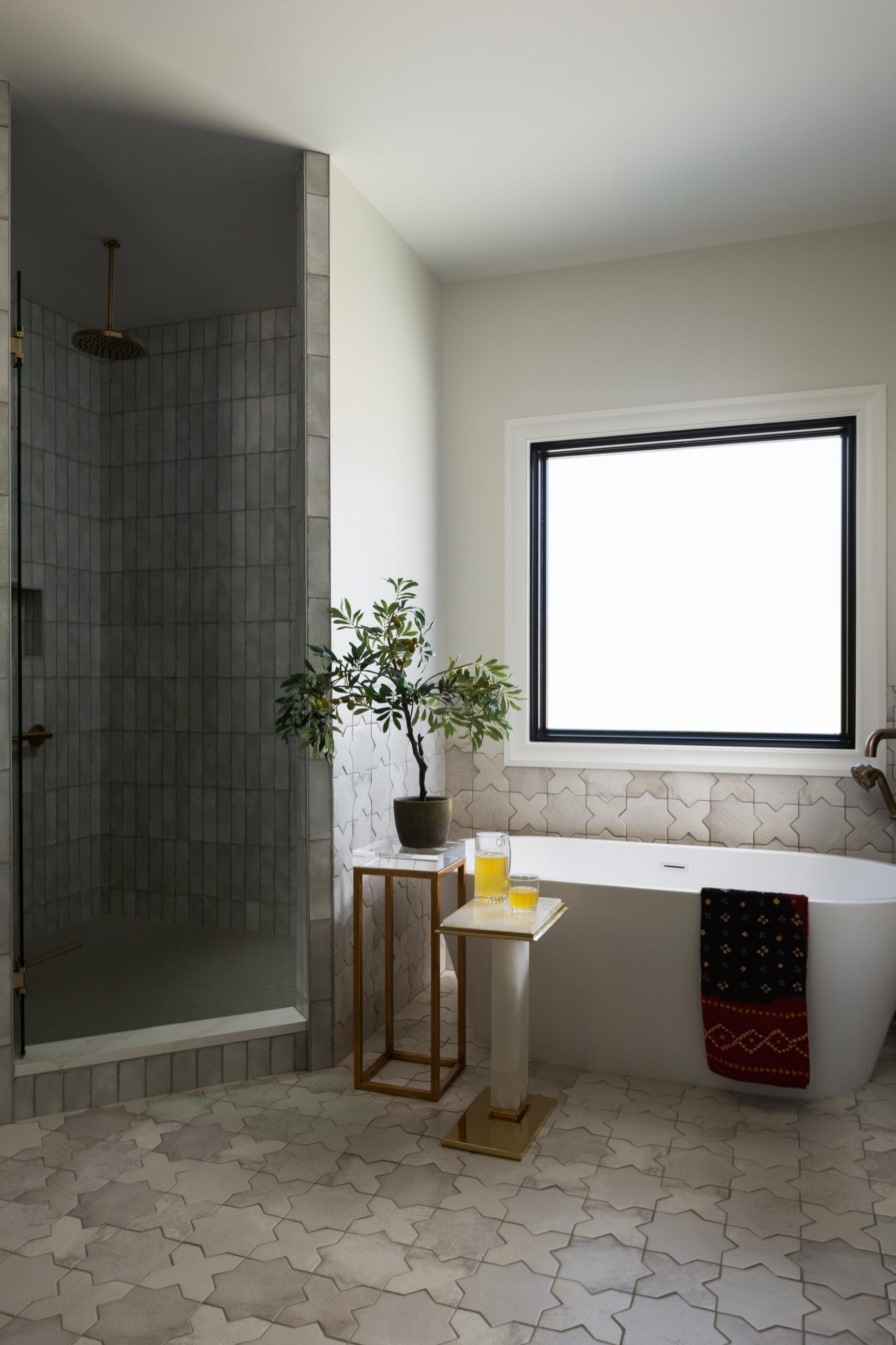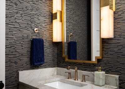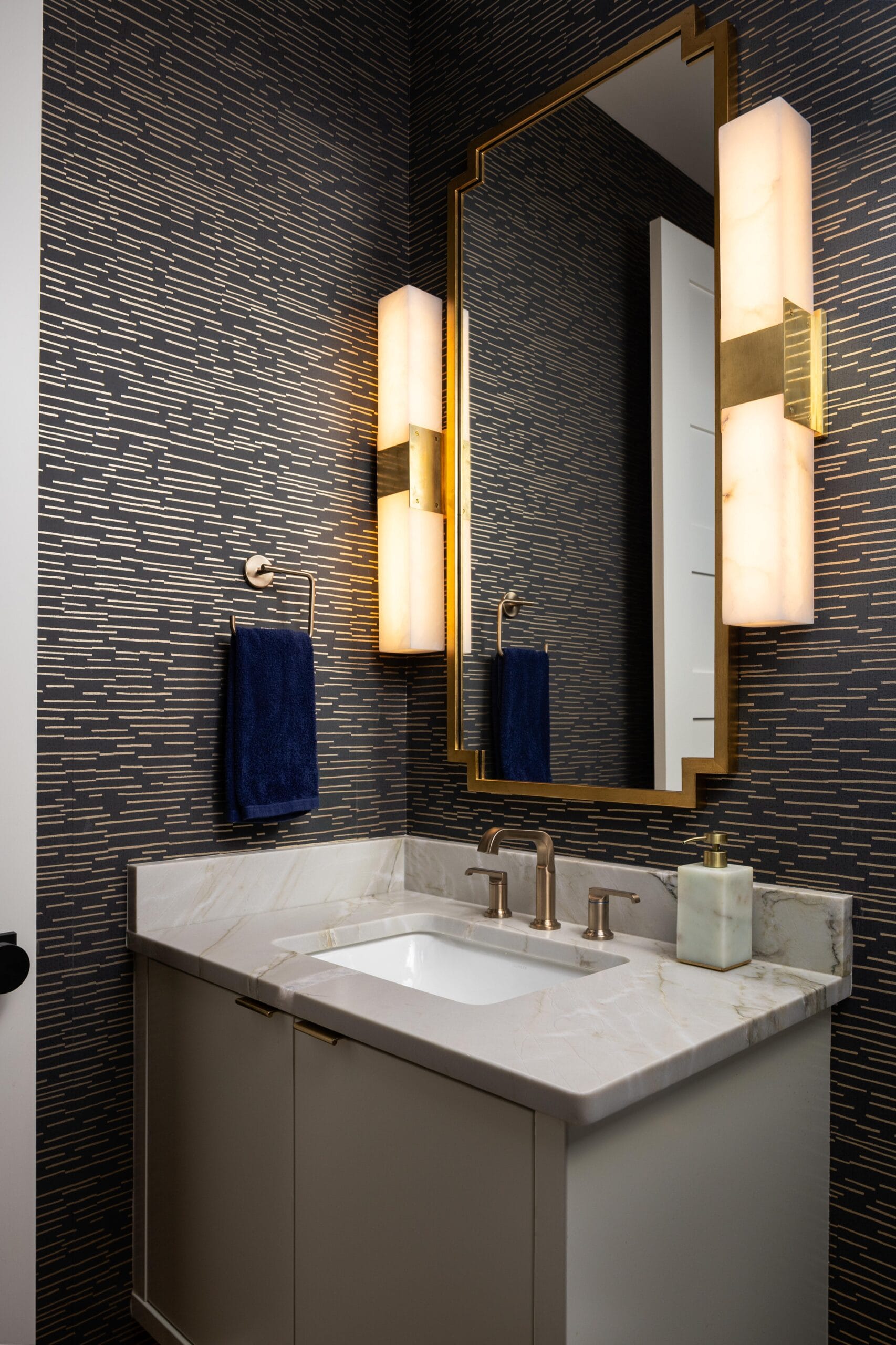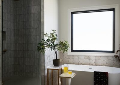 Equally important is how contrast and light shape the mood. A mix of soft neutrals with deeper, moodier moments can make a bathroom feel layered and personal rather than flat. Sculptural lighting, patterned walls, and carefully placed greenery bring depth without overwhelming the space, while generous windows and reflective surfaces keep everything feeling open and fresh. The result is a room that feels both functional and indulgent—a place designed not just to be used, but genuinely enjoyed.