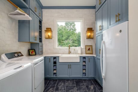This thoughtfully designed flex room proves that practicality and timeless style can coexist beautifully. Soft blue cabinetry sets a calm, classic tone while offering abundant storage tailored to everyday needs—from open shelving that keeps frequently used appliances within reach to custom cubbies that neatly organize linens and pantry items. The seamless integration of laundry, prep space, and storage transforms the room into a hardworking hub, proving that utility doesn’t have to sacrifice elegance. Brass hardware, crown molding, and clean-lined cabinetry ground the space in traditional design, lending it a sense of permanence and refinement.