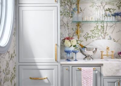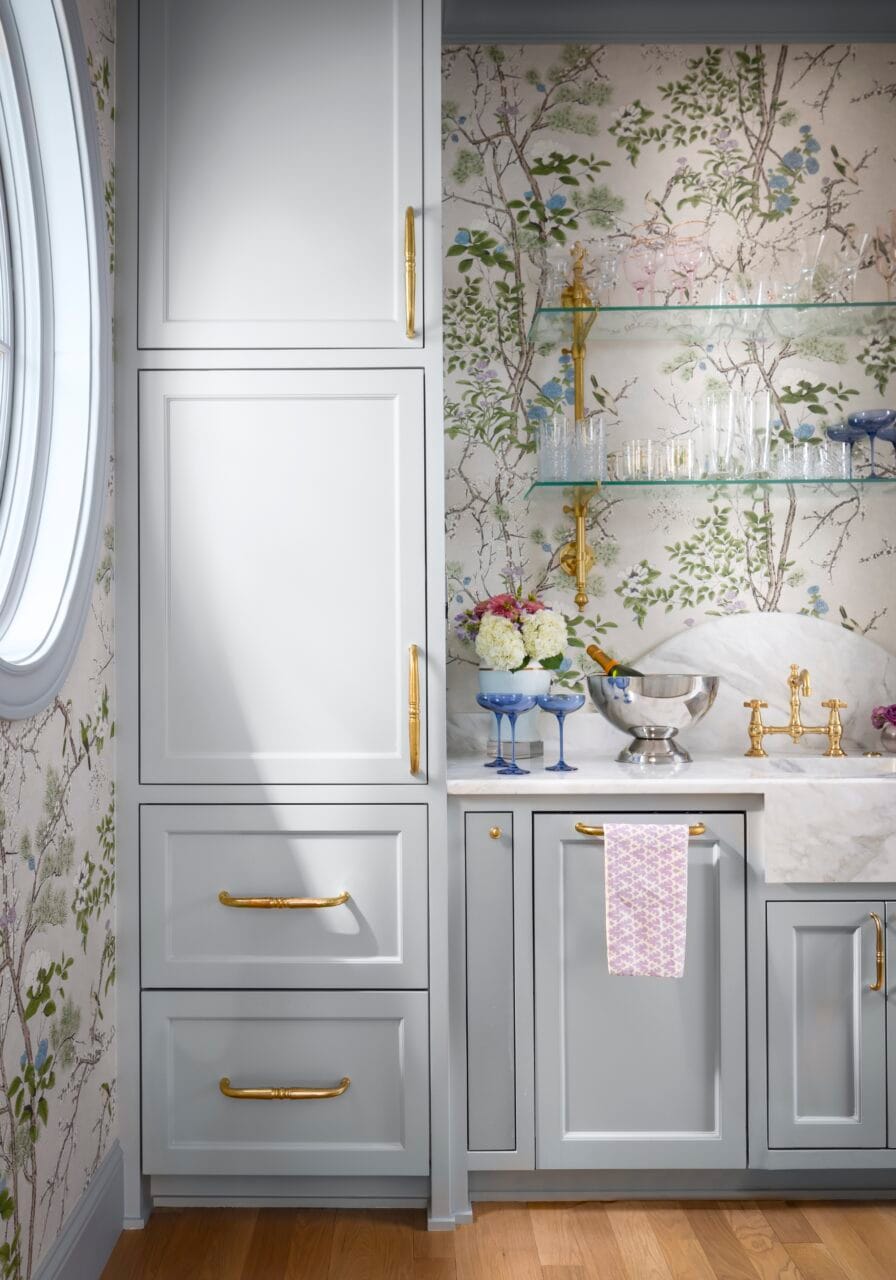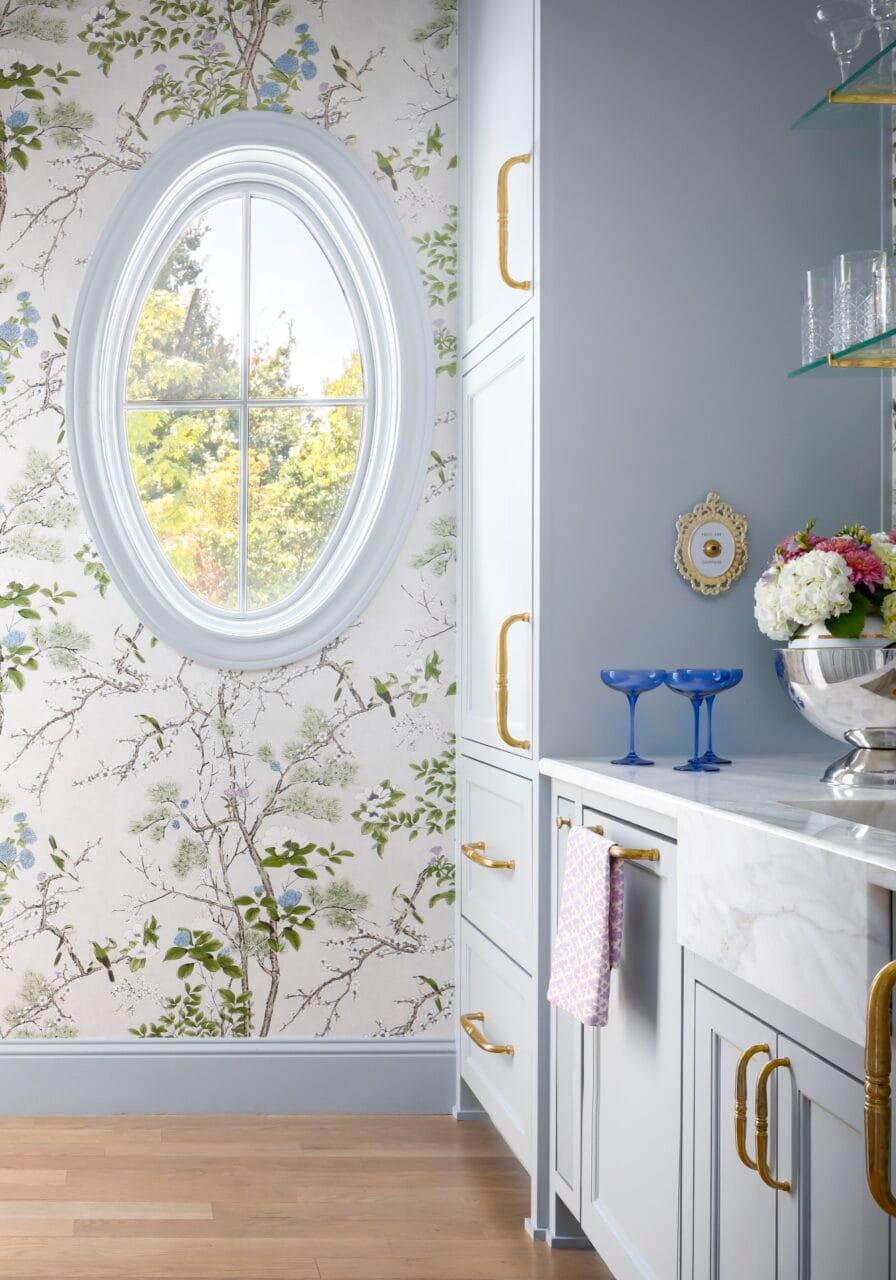 Picture a nook where powder-blue cabinetry meets stunning botanical wallpaper, sunlight catching on brass fixtures, and a bowl of fresh blooms brightens the countertop. The effect is both polished and poetic, creating a space that feels alive, inspired, and deeply personal. Whimsical design like this celebrates the beauty of contrast and the joy of detail, encouraging us to see our surroundings not just as rooms, but as reflections of our imagination.